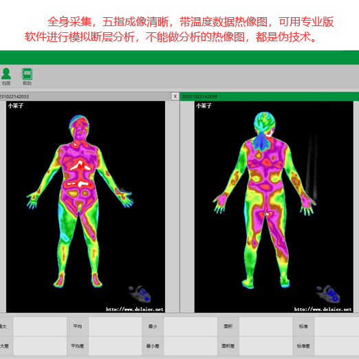 全身采集五指成像清晰,带温度数据热像图,可通过专业版软件进行模拟等曾分析,不能做模拟断层分析的热像图,都是忽悠人产品,谨记!